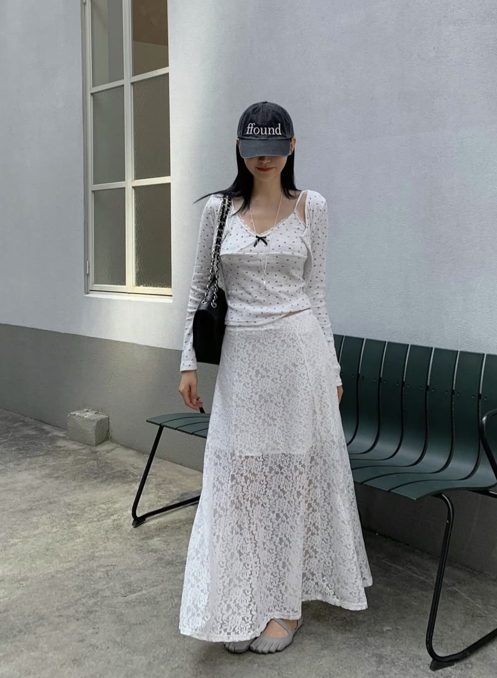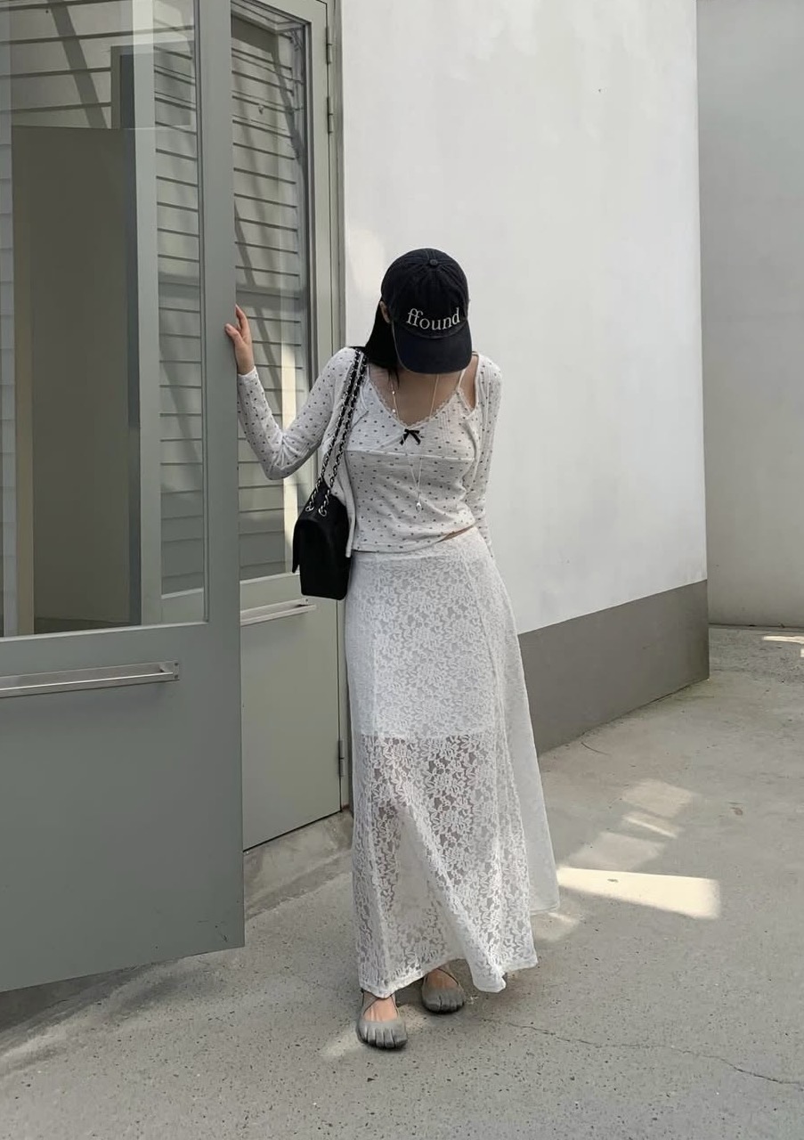 蕾絲滾邊斜切光澤半裙