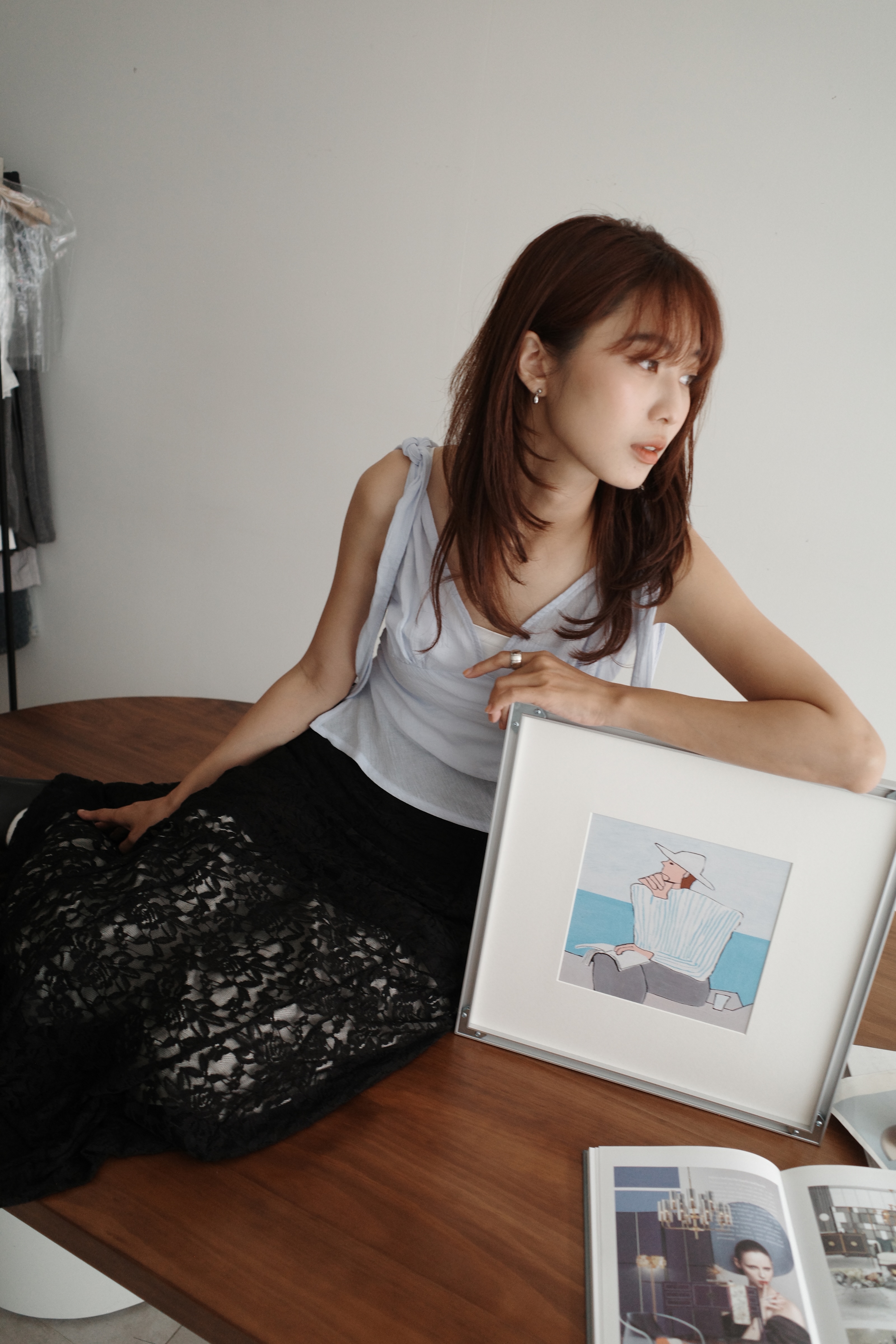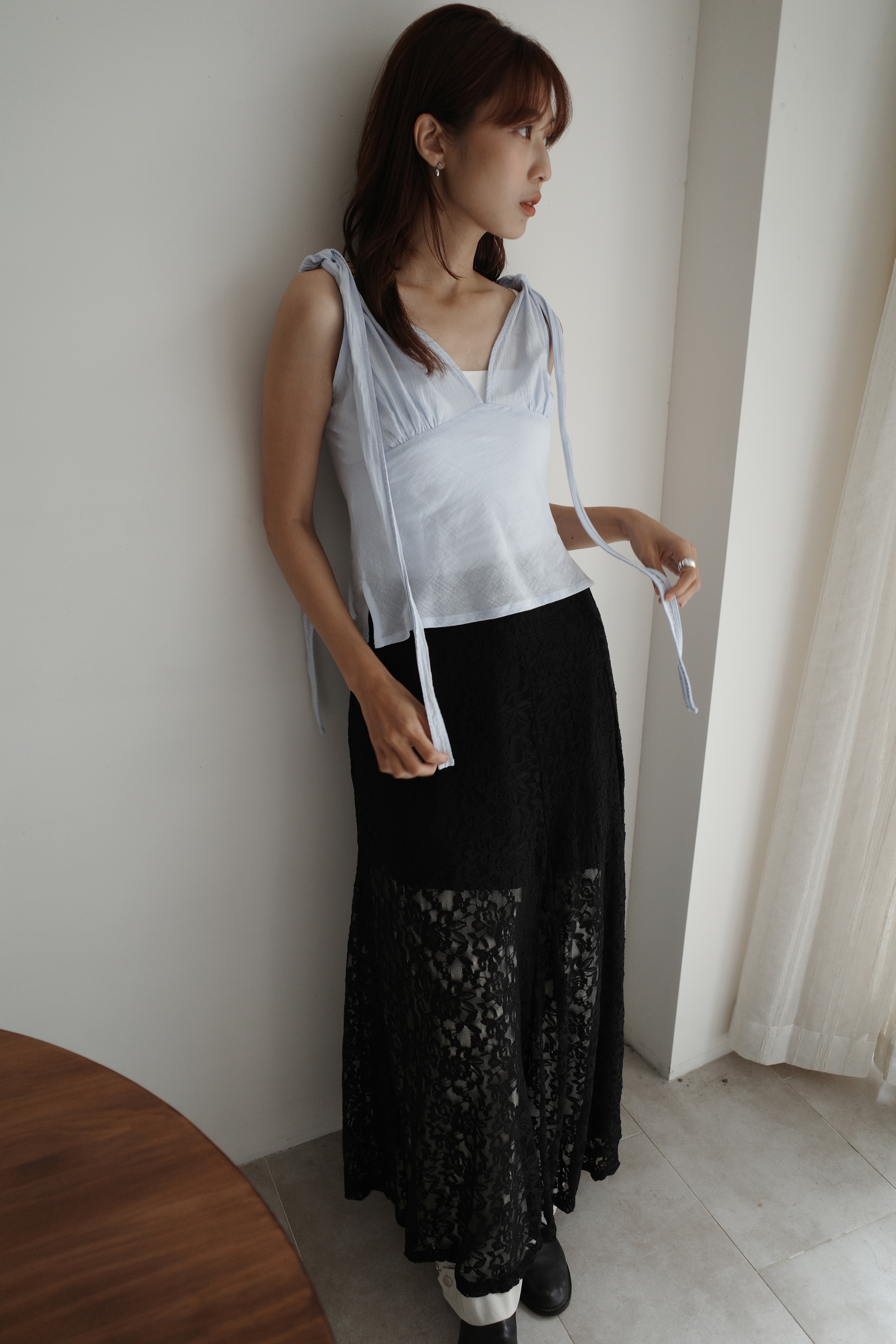 蕾絲滾邊斜切光澤半裙
